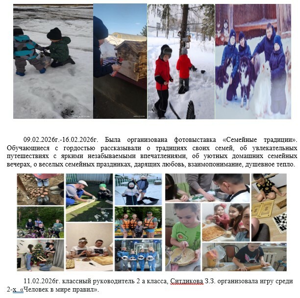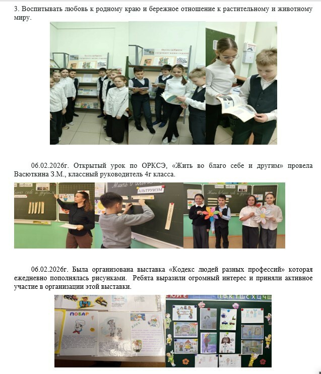 09.02.2026-13.02.2026г. Среди 1-4 классов прошла акция «Золотое правило нравственности» Задачи акции: вывести золотое правило этики, усвоить «золотое правило этики», сделав его условием оценивания собственного поведения; создать условия для формирования навыков работы в группе; формировать навыки работы с различным объёмом информации; развивать умения выделять главное, активизировать словарный запас; воспитание доброжелательности и эмоционально-нравственной отзывчивости. 09.02.2026г. среди обучающихся 1-4 классов был проведён «День добрых дел». Цель – воспитание у детей положительных качеств характера, способствование сплочению коллектива, мотивирование детей на совершение добрых поступков, добрых дел во благо других. Ребята и учителя старались сделать добрые и полезные дела, стремились помочь ближнему, заражали добрым примером окружающих. Ученики рассказали о своих добрых делах, которые они осуществляют постоянно. Это помощь родителям по хозяйству, помощь в учебе детям которые испытывают затруднения, помощь приютам для животных. Участие в Дне добрых дел позволило ребятам приобрести опыт "бескорыстного оказания помощи другим"