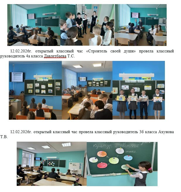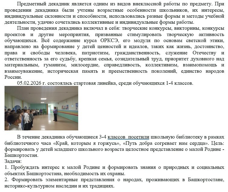 17.02.2026 г. Кулик Л.А., руководитель ШМО учителей 4 классов, подвела итоги декадника. Предметная неделя по курсу ОРКСЭ прошла успешно. Поставленные цели были выполнены. Все мероприятия были направлены на развитие познавательного интереса через внеурочные формы работы, воспитание у учащихся патриотизма, нравственного поведения и культуры речи. Все учителя в ходе предметной недели проявили хорошие организаторские способности, создали праздничную творческую атмосферу. Учителя применяют на уроках элементы современных педагогических технологий и методик преподавания: проблемного обучения, развития критического мышления, интерактивные, групповые методы работы, разнообразные творческие методы, работают над формирование функциональной грамотности учащихся. Проведение мероприятий освещалось н официальном сайте МОАУ СОШ№6.