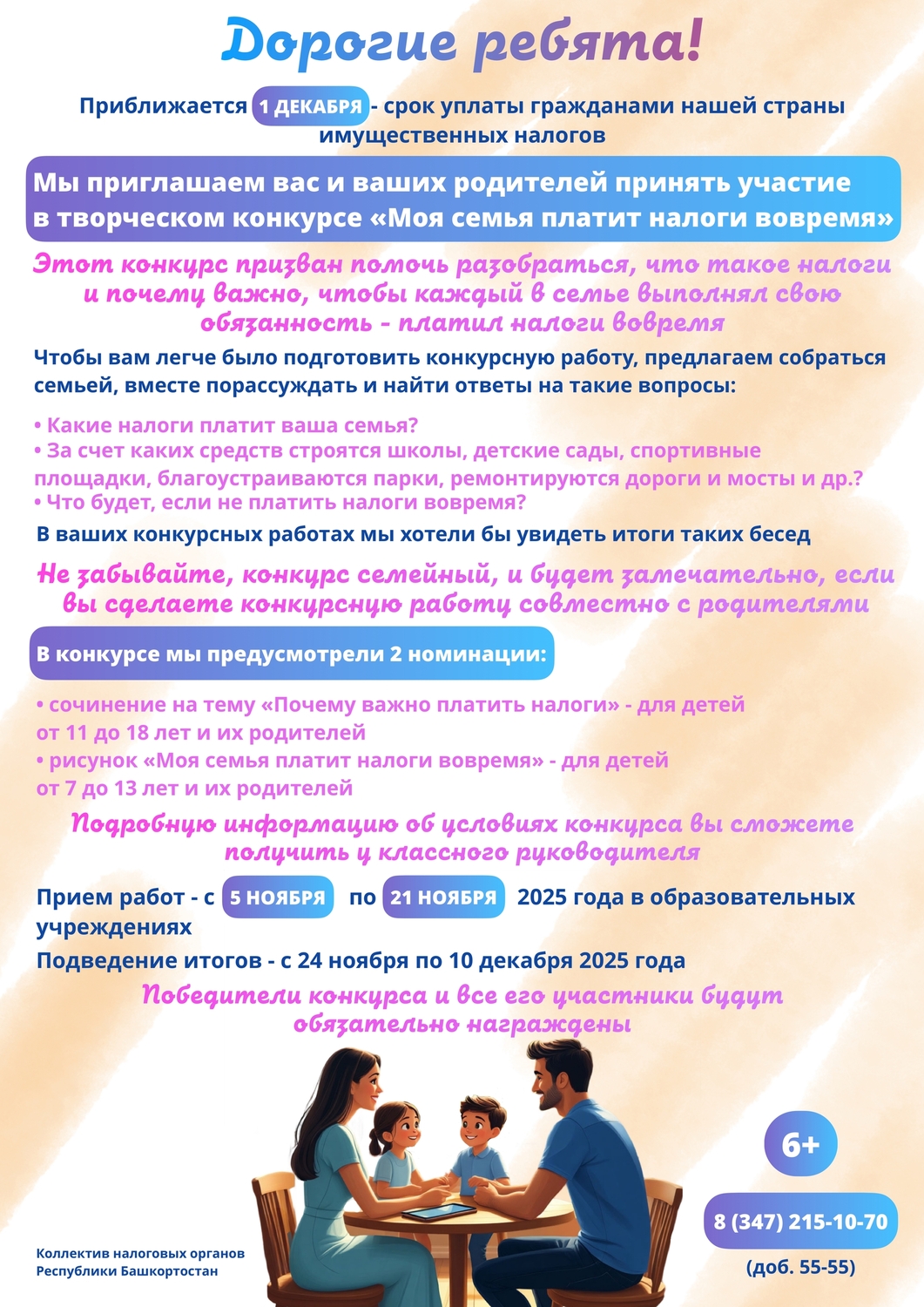 ❗️В целях повышения финансовой, налоговой культуры и грамотности подрастающего поколения УФНС России по Республике Башкортостан совместно с Государственным автономным учреждением дополнительного профессионального образования Института развития образования Республики Башкортостан организован тематический конкурс «Моя семья платит налоги вовремя»
